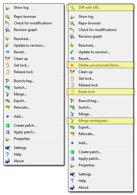 Note: Each of the extended options can be selected in the TortoiseSVN Context Menu options.