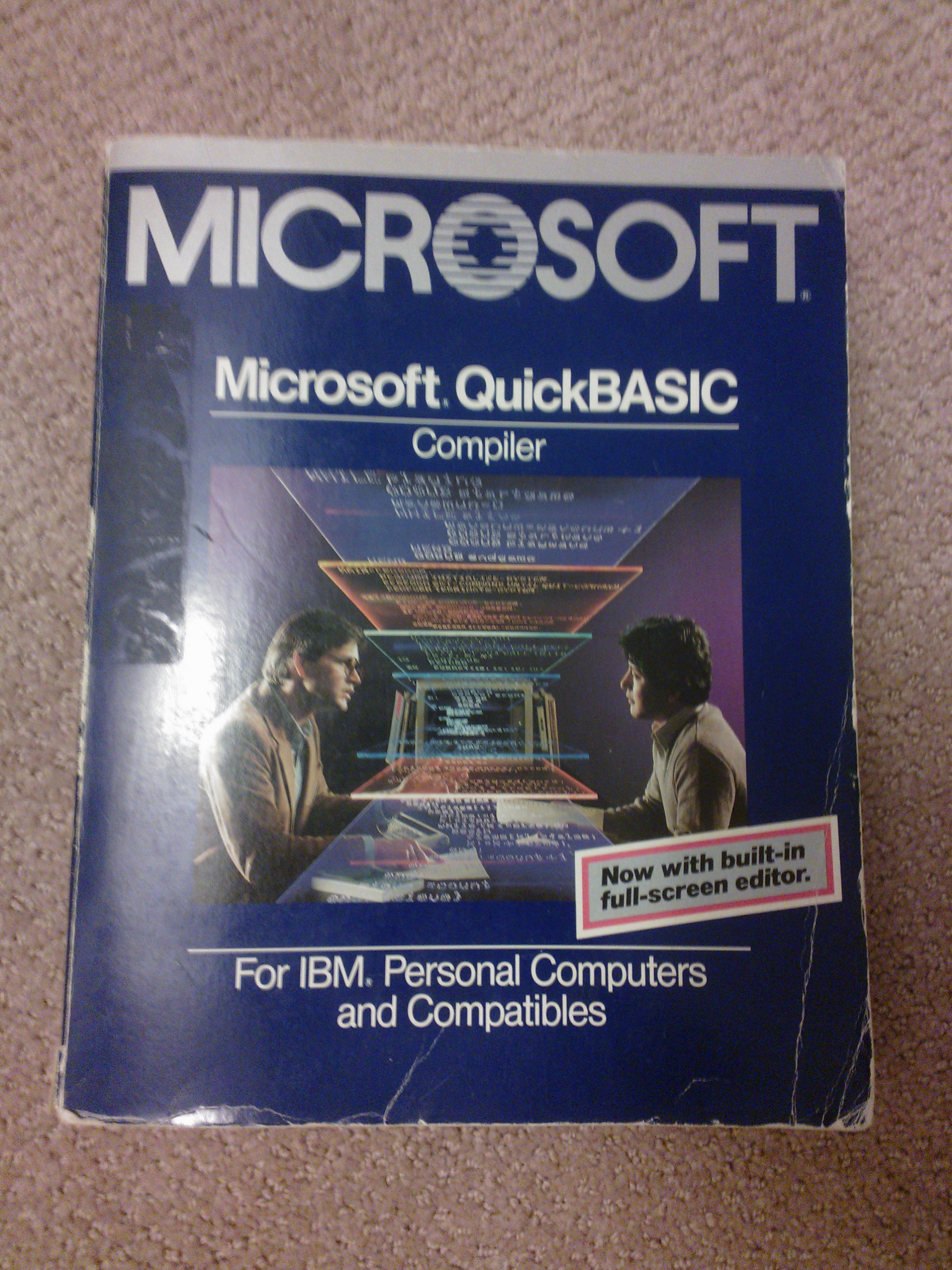I’m not sure what the guys on the cover are doing but I think the one on the right is getting reprimanded. The guy on the left has this expression that says “WTF? Another GOTO?” Also, the built-in full-screen editor apparently turns your PC into The Grid from TRON. Copyright 1986.
