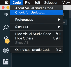 Once you’ve set update.channel to none and are ready to apply any available updates you can do so by selecting the Check for Updates option under the Code menu on the Mac or the Help menu on Windows.