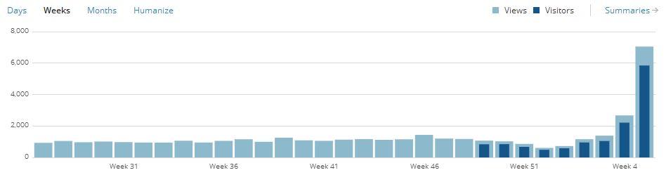 The weekly traffic graph shows 31 weeks of history. You can clearly see the annual dip around the holidays followed by this week’s spike.